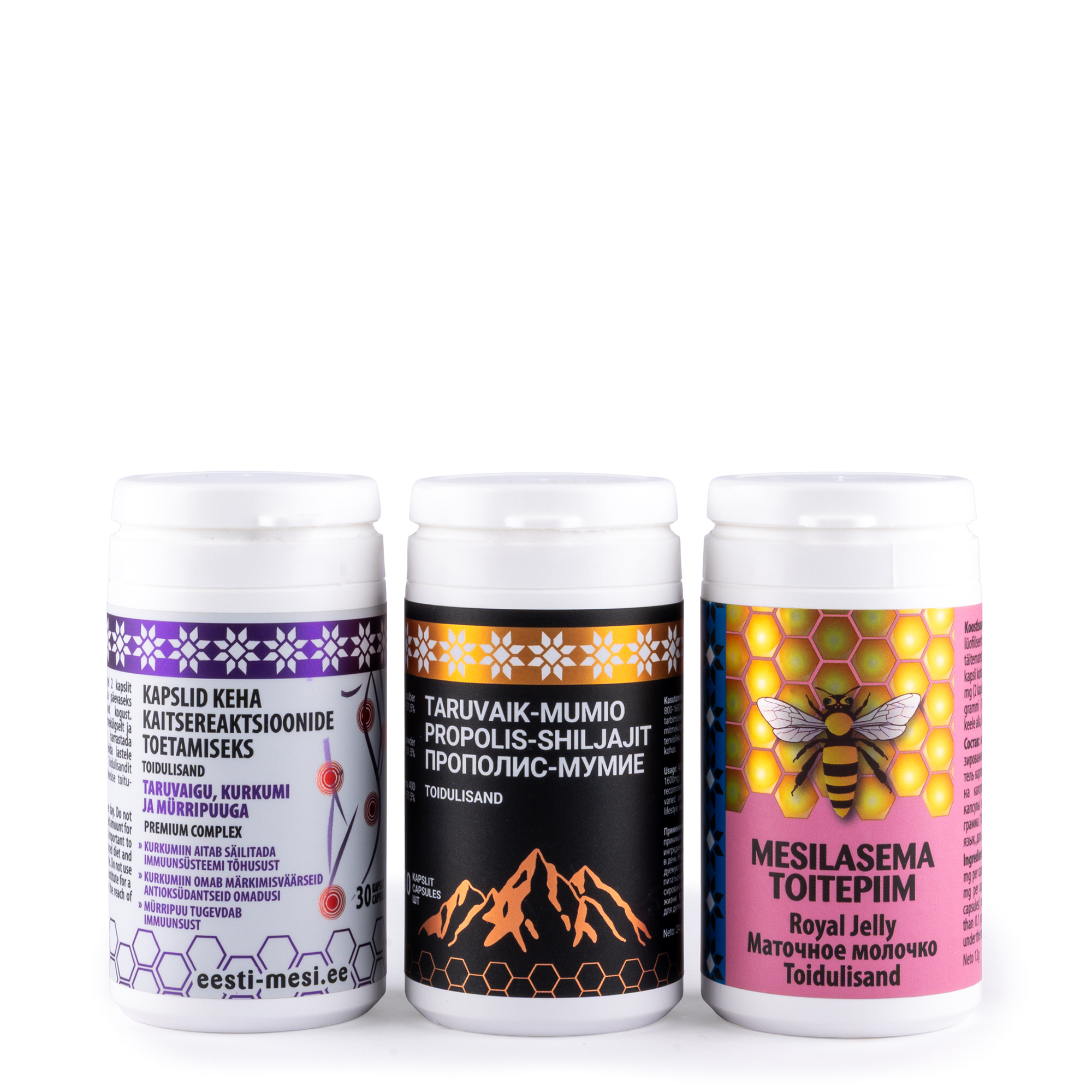 Komplekt koosneb – 1 purk mesilaspiimakapsleid(30 kapslit), 1 purk Mumio-taruvaigukapsleid (30tk) ja 1 purk kaplseid keha kaitsereaktsioonide toetuseks (30tk)