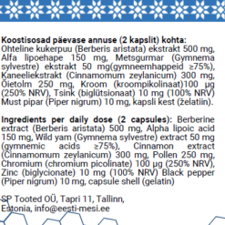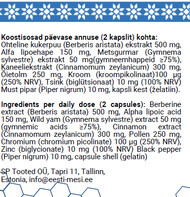 Koostisosad: Ohteline kukerpuu (Berberis aristata) ekstrakt 500 mg, Alfa lipoehape 150 mg, Metsgurmar (Gymnema sylvestre) ekstrakt 50 mg(gymneemhappeid ≥75%), Kaneeliekstrakt (Cinnamomum zeylanicum) 300 mg, Õietolm 250 mg, Kroom (kroompikolinaat)100 µg (250% NRV), Tsink (biglütsionaat) 10 mg (100% NRV) Must pipar (Piper nigrum) 10 mg, kapsli kest (želatiin)